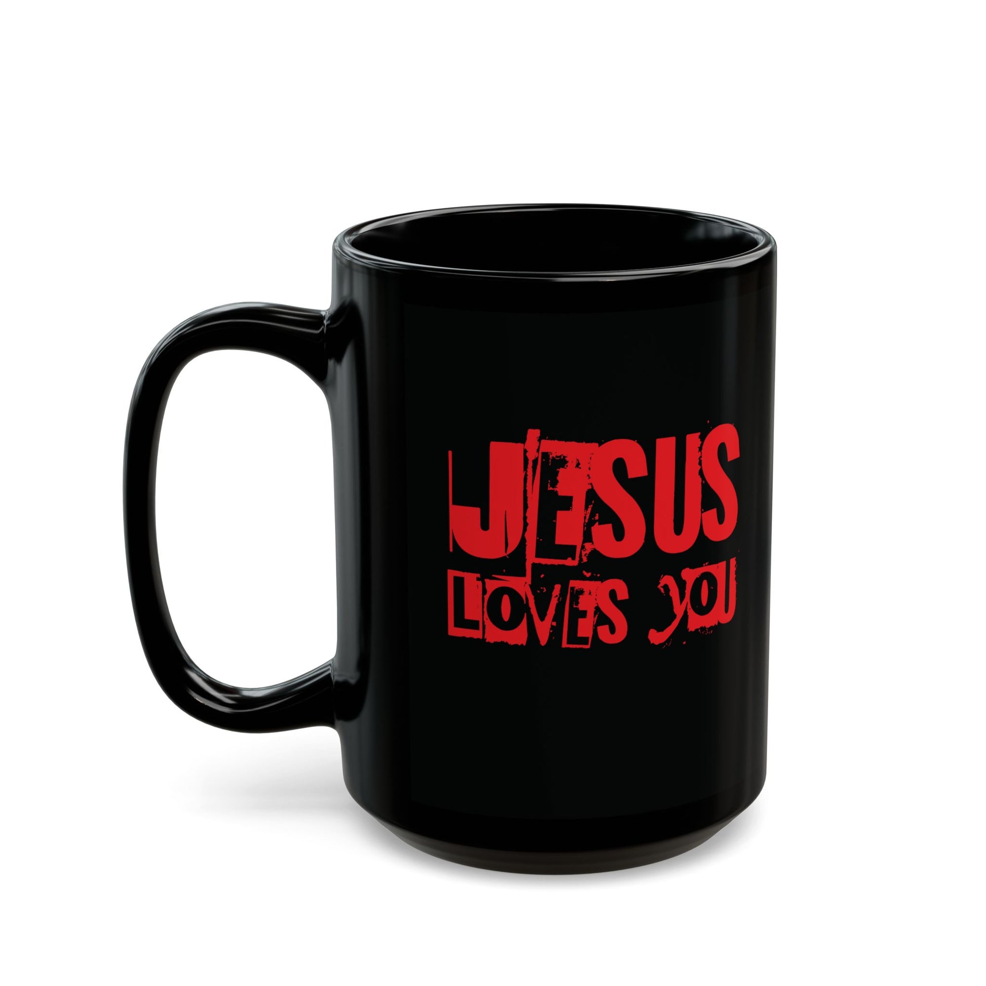 This black ceramic mug features the phrase 'JESUS LOVES YOU' giving off a positive and encouraging vibe. Perfect for those who desire to bring fame to Jesus' name and reminding others of His love. Ideal for gifting during holidays, birthdays, religious celebrations, or any occasion. Great for evangelism events and everyday use.