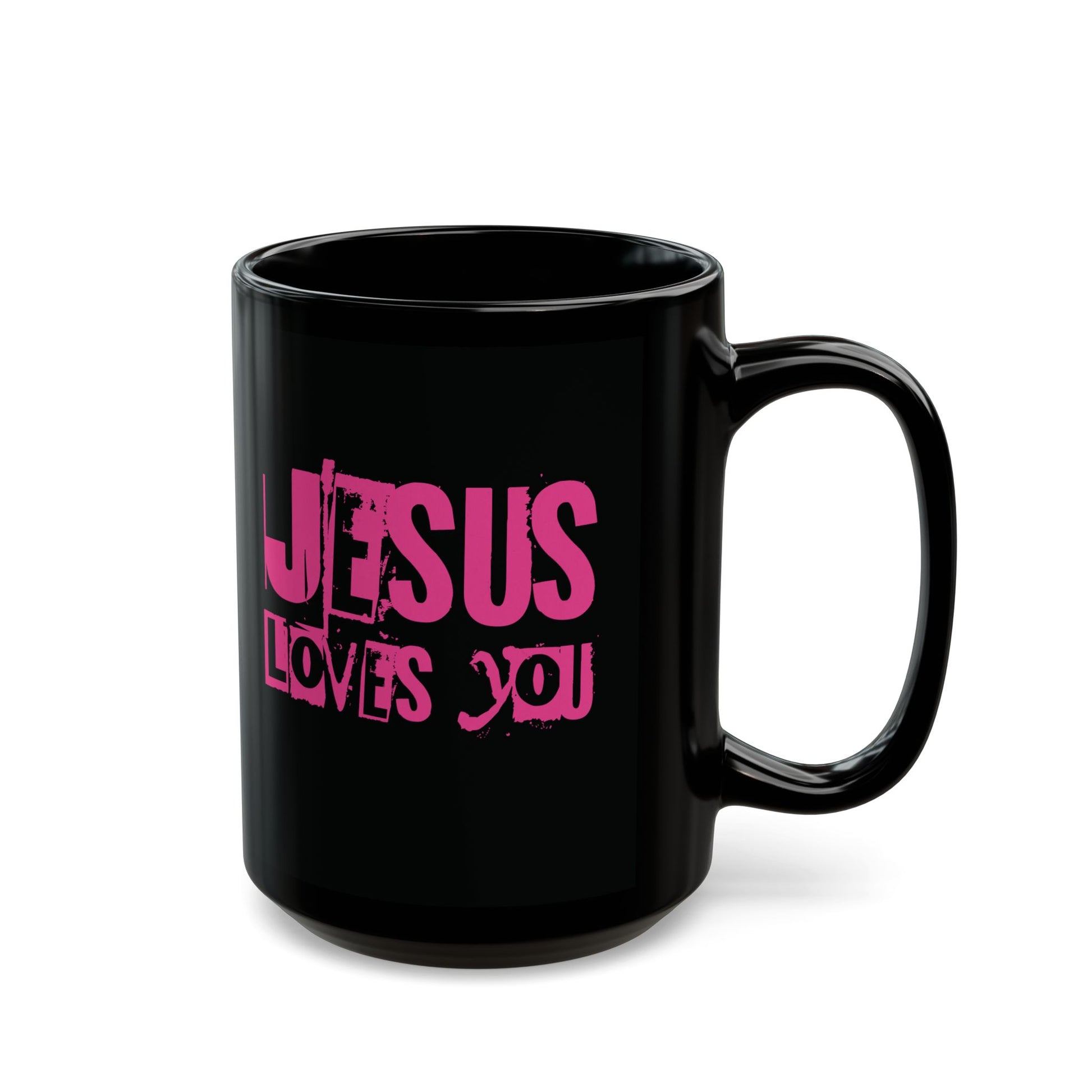 This black ceramic mug features the phrase 'JESUS LOVES YOU' giving off a positive and encouraging vibe. Perfect for those who desire to bring fame to Jesus' name and reminding others of His love. Ideal for gifting during holidays, birthdays, religious celebrations, or any occasion. Great for evangelism events and everyday use.
